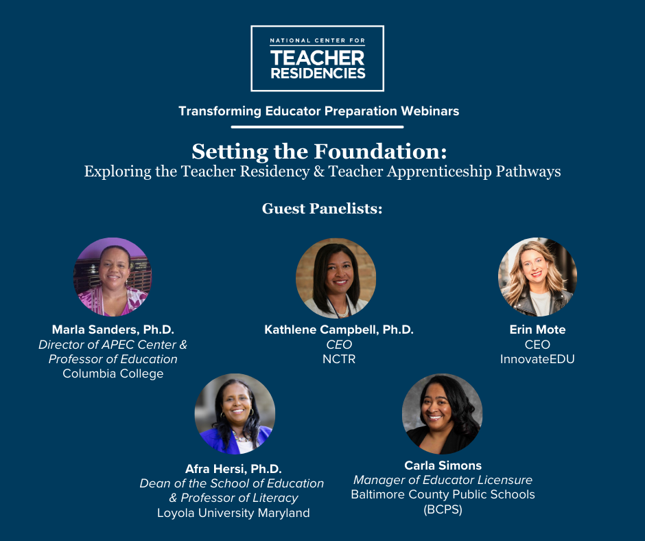Learn from experts in the field to understand how teacher residencies and teacher registered apprenticeships align to support the same mission: recruiting and preparing educators for classrooms across the nation. Inspired by NCTR’s report, Teacher Residencies as the Foundation of Teacher Registered Apprenticeship Programs, this session will: